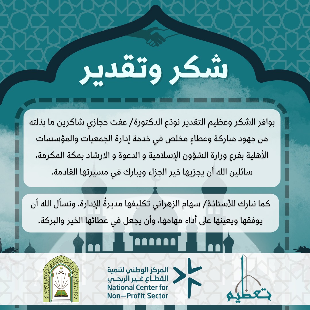 بوافر الشكر وعظيم التقدير، تتقدم جمعية عمارة المساجد والعناية بها (تعظيم) بخالص الامتنان للدكتورة عفت حجازي
